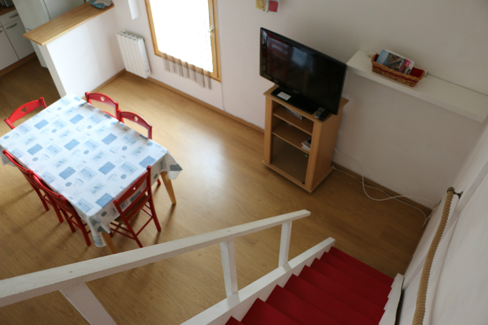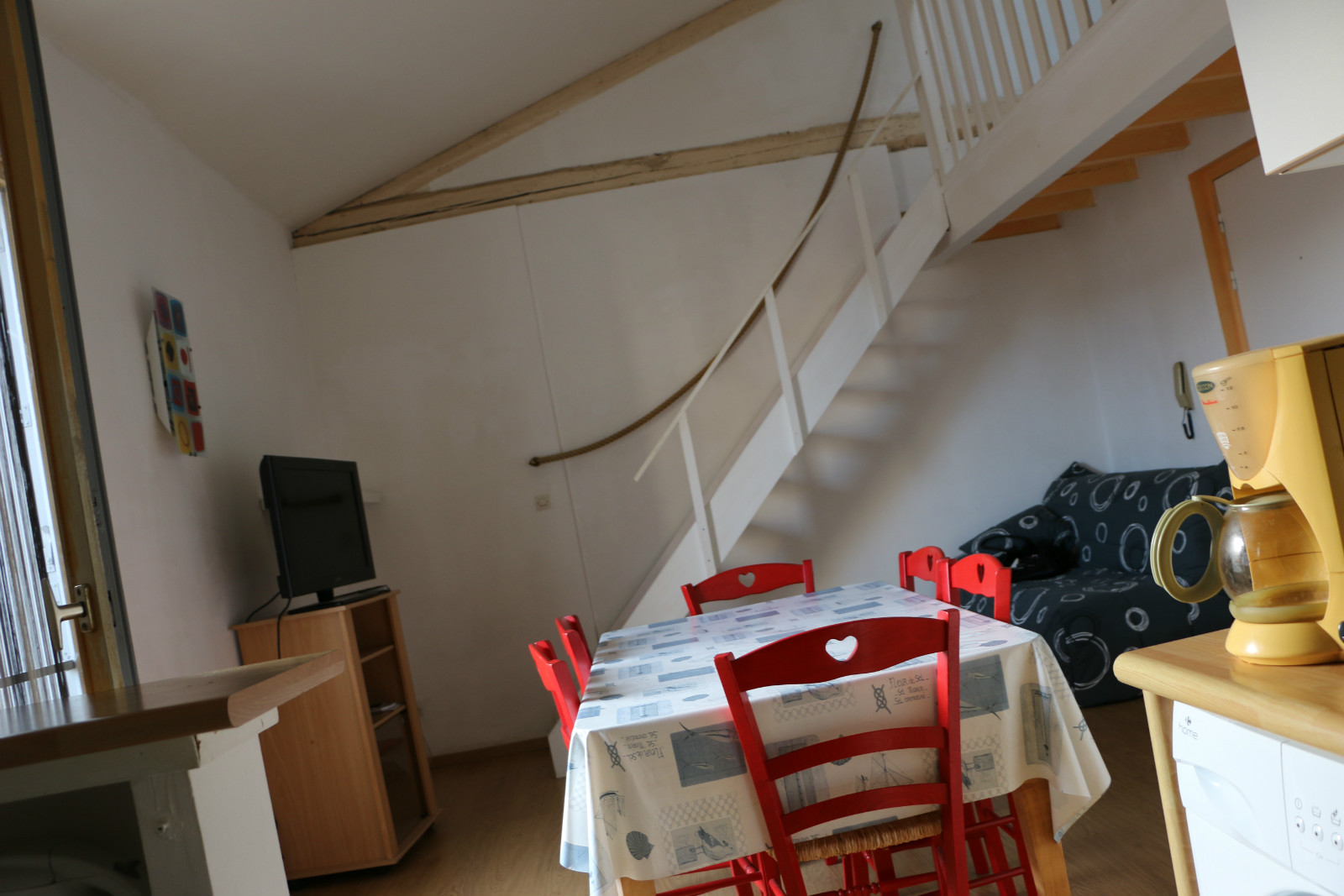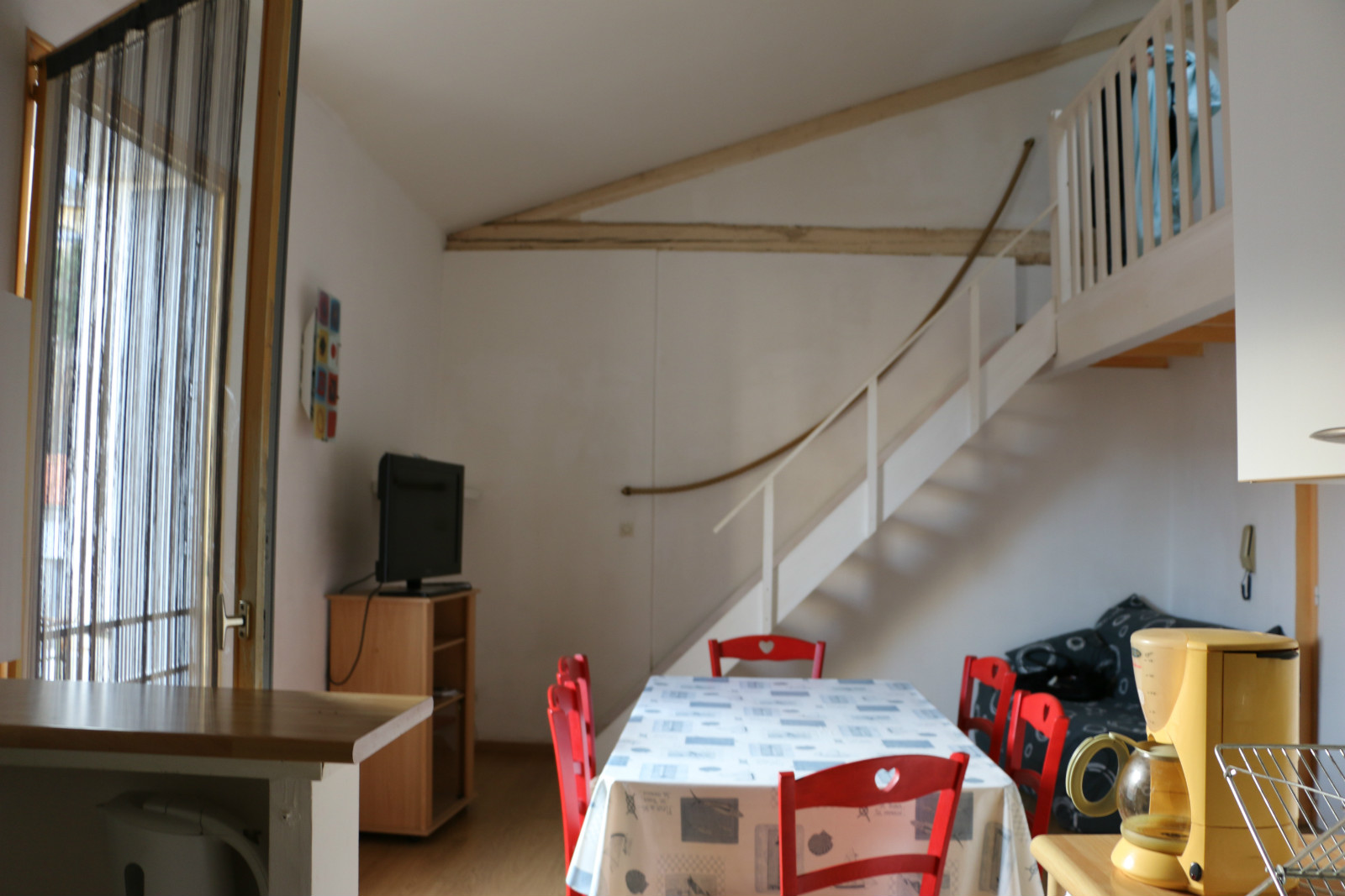 Pièce à vivre avec canapé convertible 2 places, cuisine ouverte toute équipée, chambre en mezzanine et chambre avec lits superposés