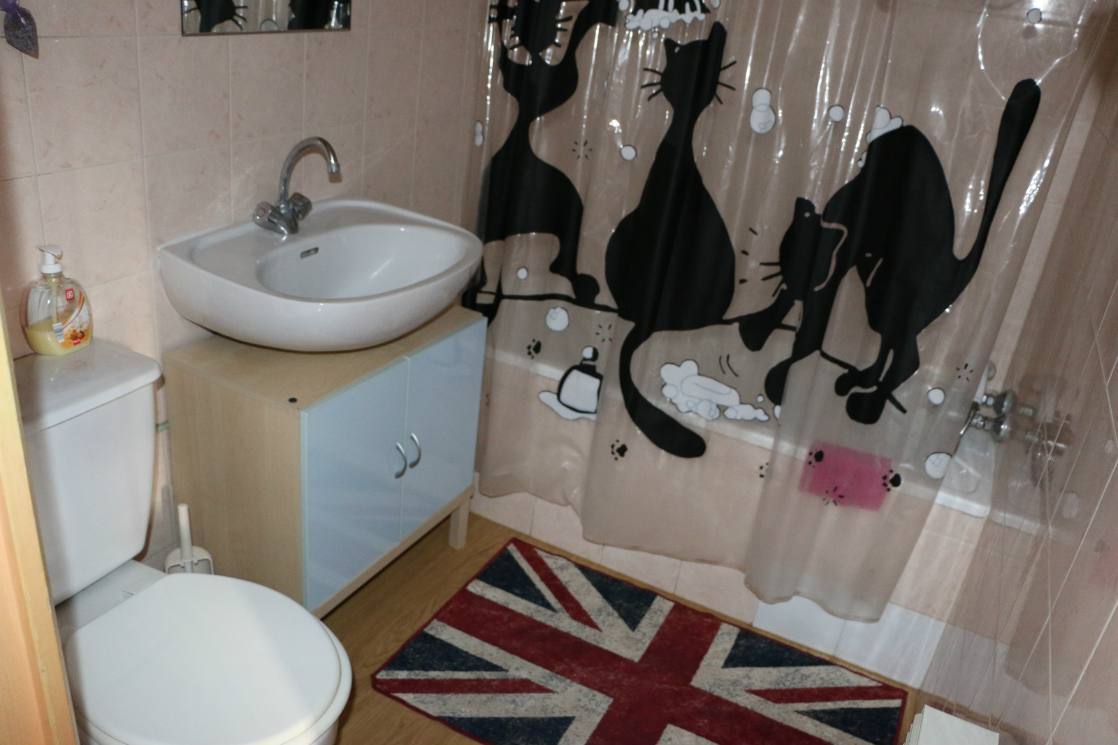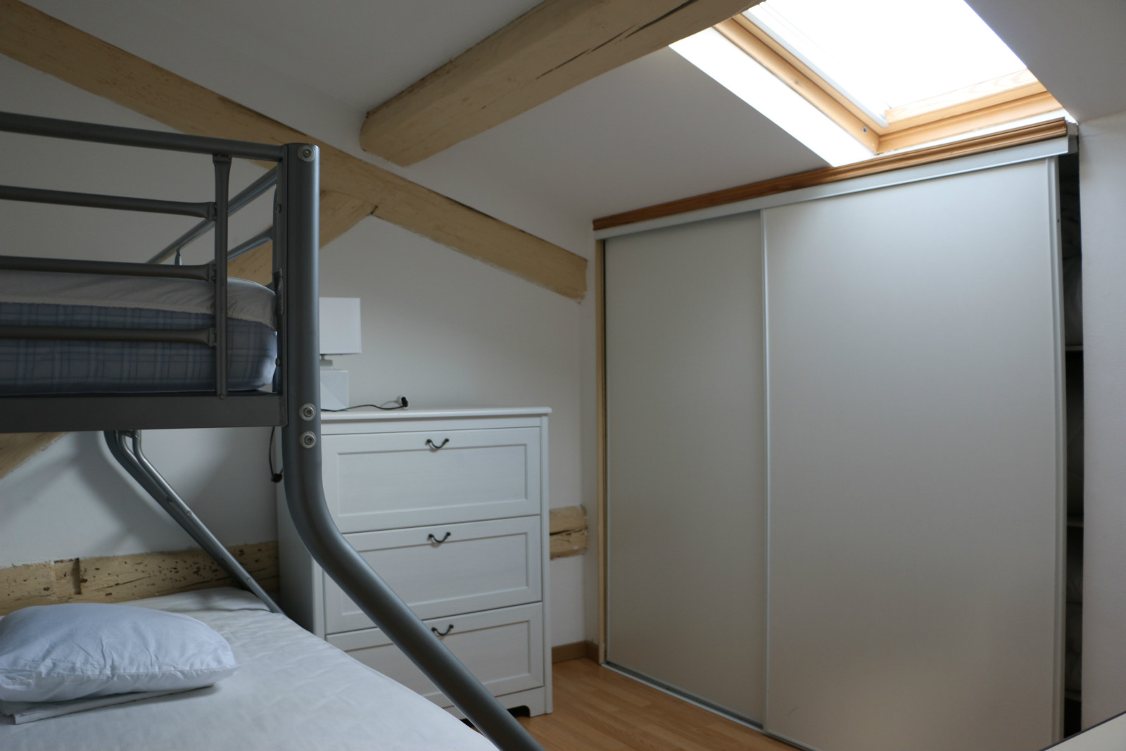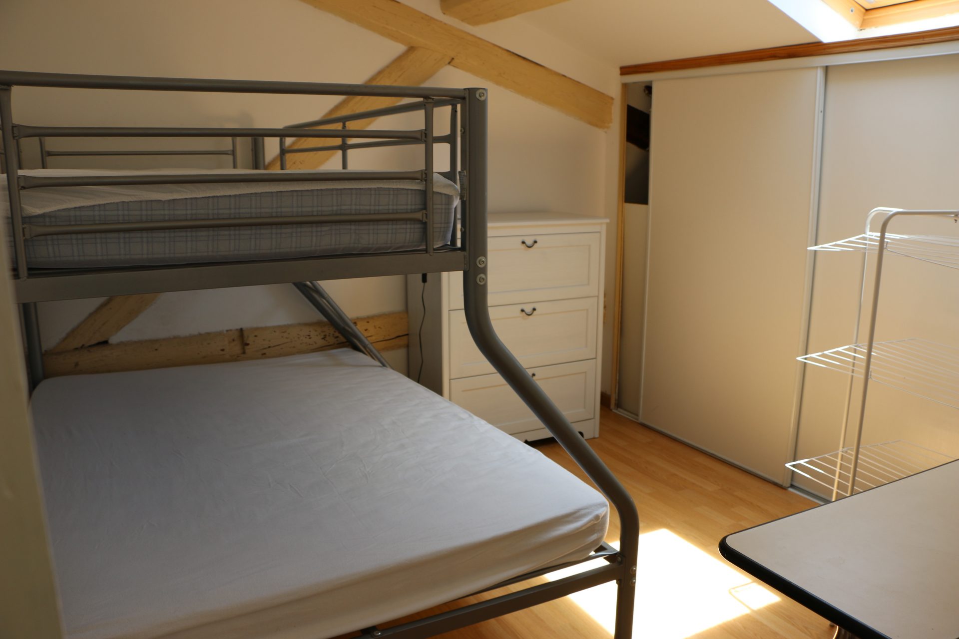Pièce à vivre avec canapé convertible 2 places, cuisine ouverte toute équipée, chambre en mezzanine et chambre avec lits superposés
