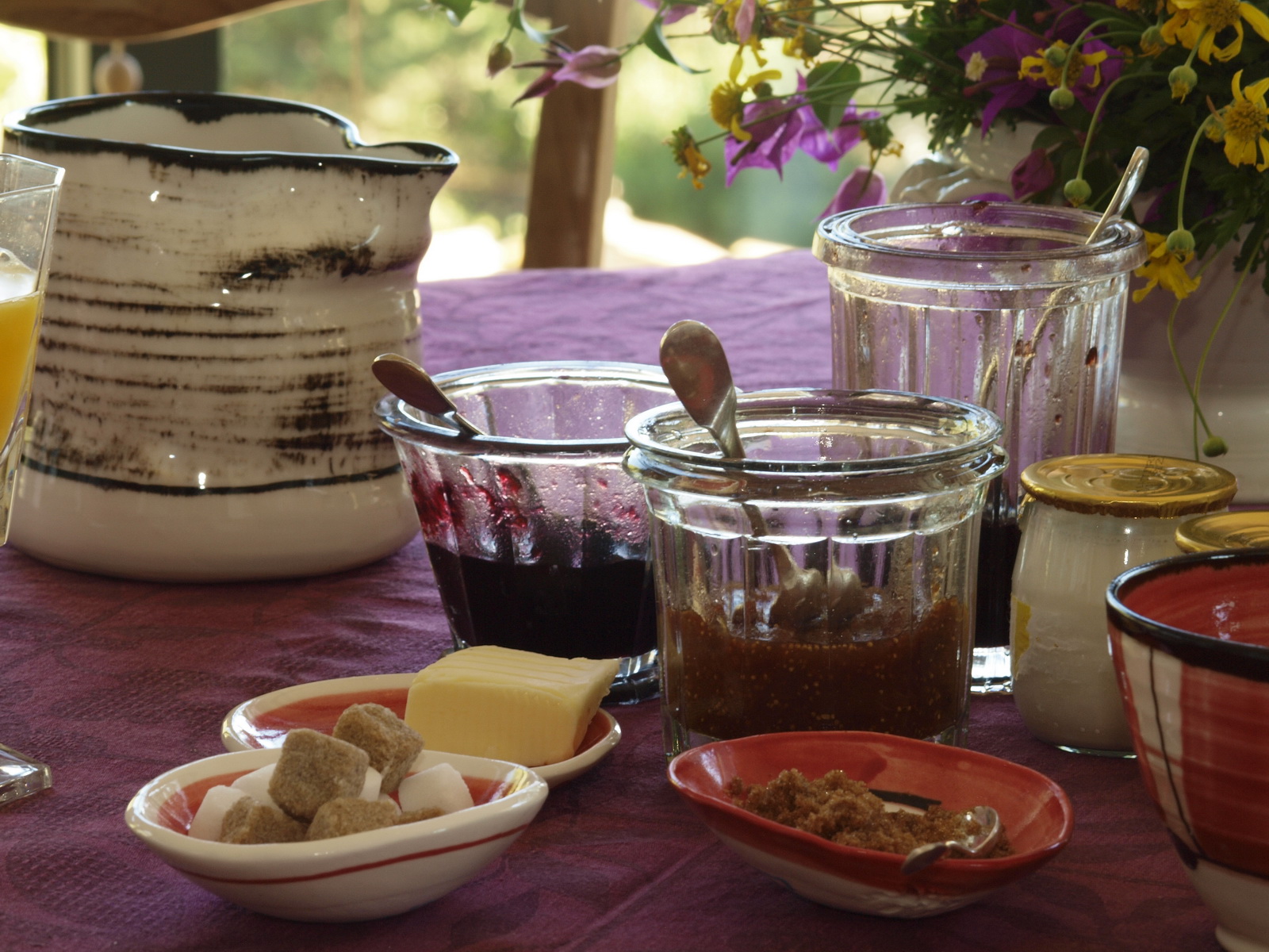 Petit déjeuner servi sur la terrasse près de la piscine ou dans la salle manger.