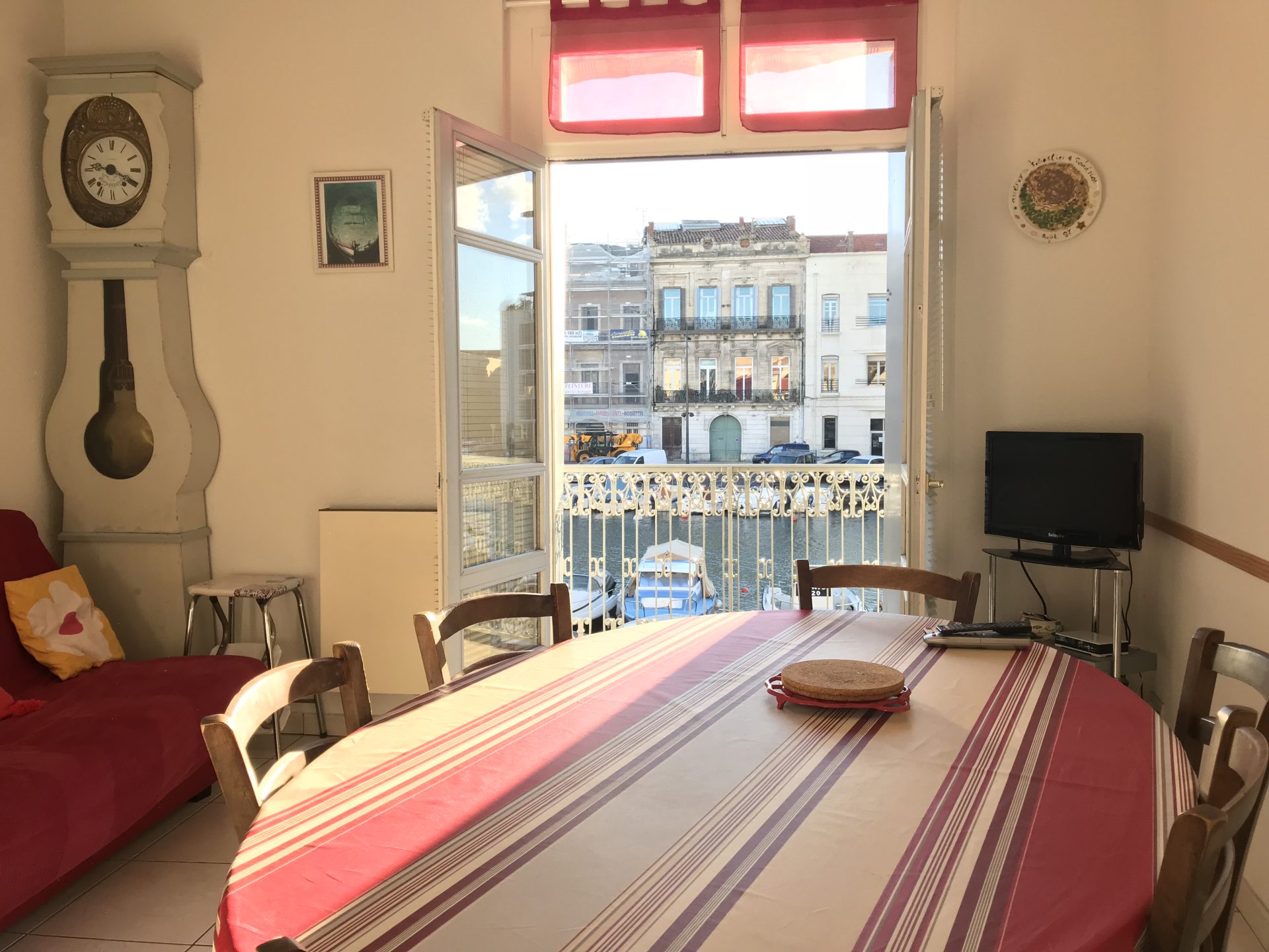 Pièce à vivre avec cuisine ouverte, coin repas, salon, balcon vue canal
