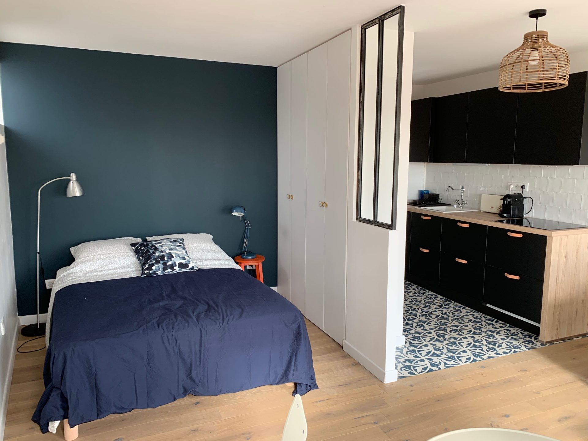 pièce à vivre avec coin cuisine, salon et espace nuit, balcon sans vis a vis