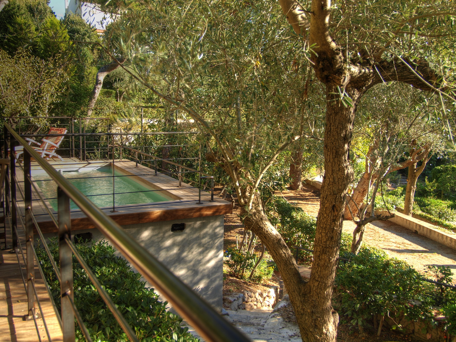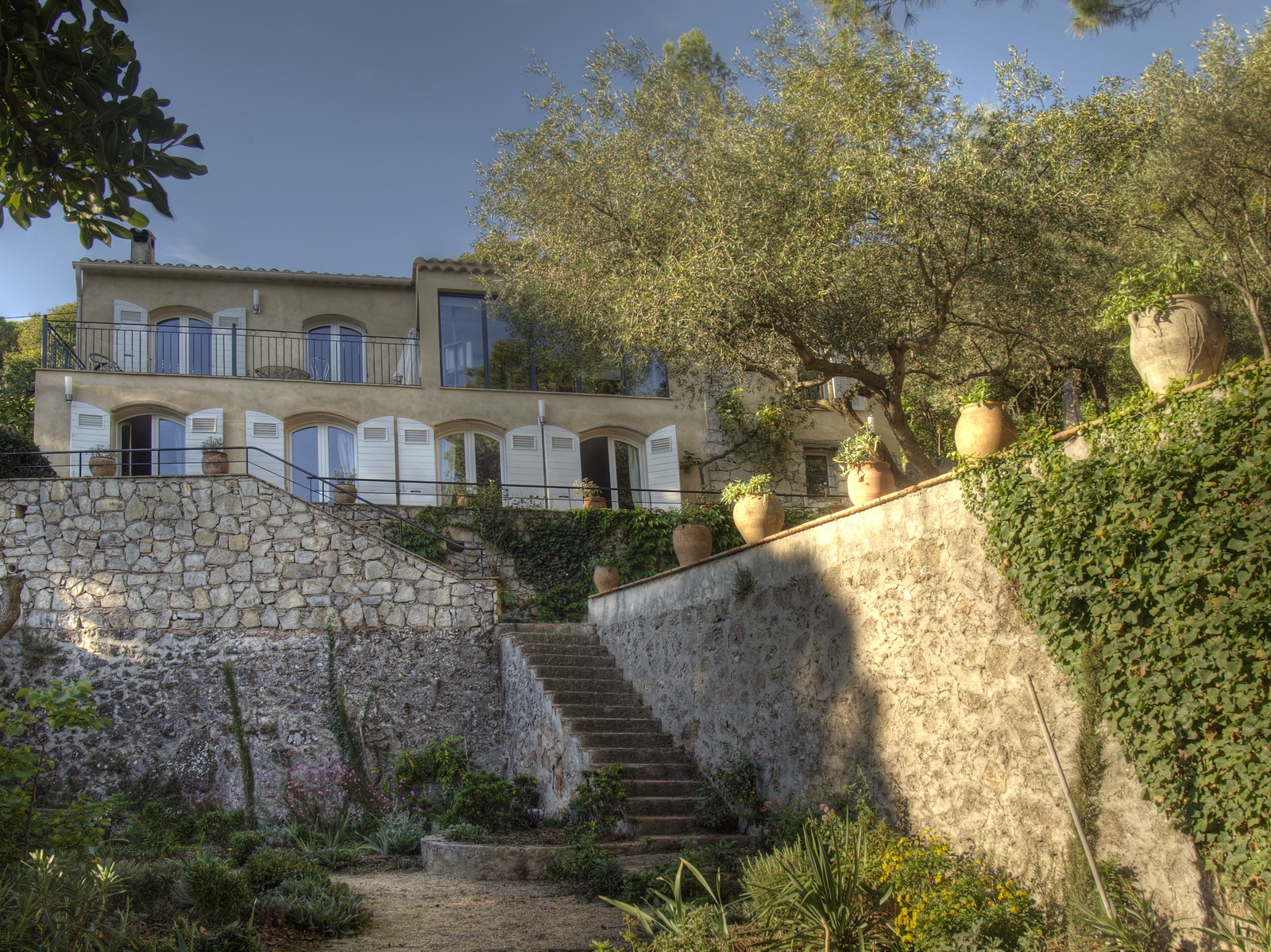 Au calme d’un jardin méditerranéen en escalier, agréable maison familiale climatisée, offrant espace et confort.