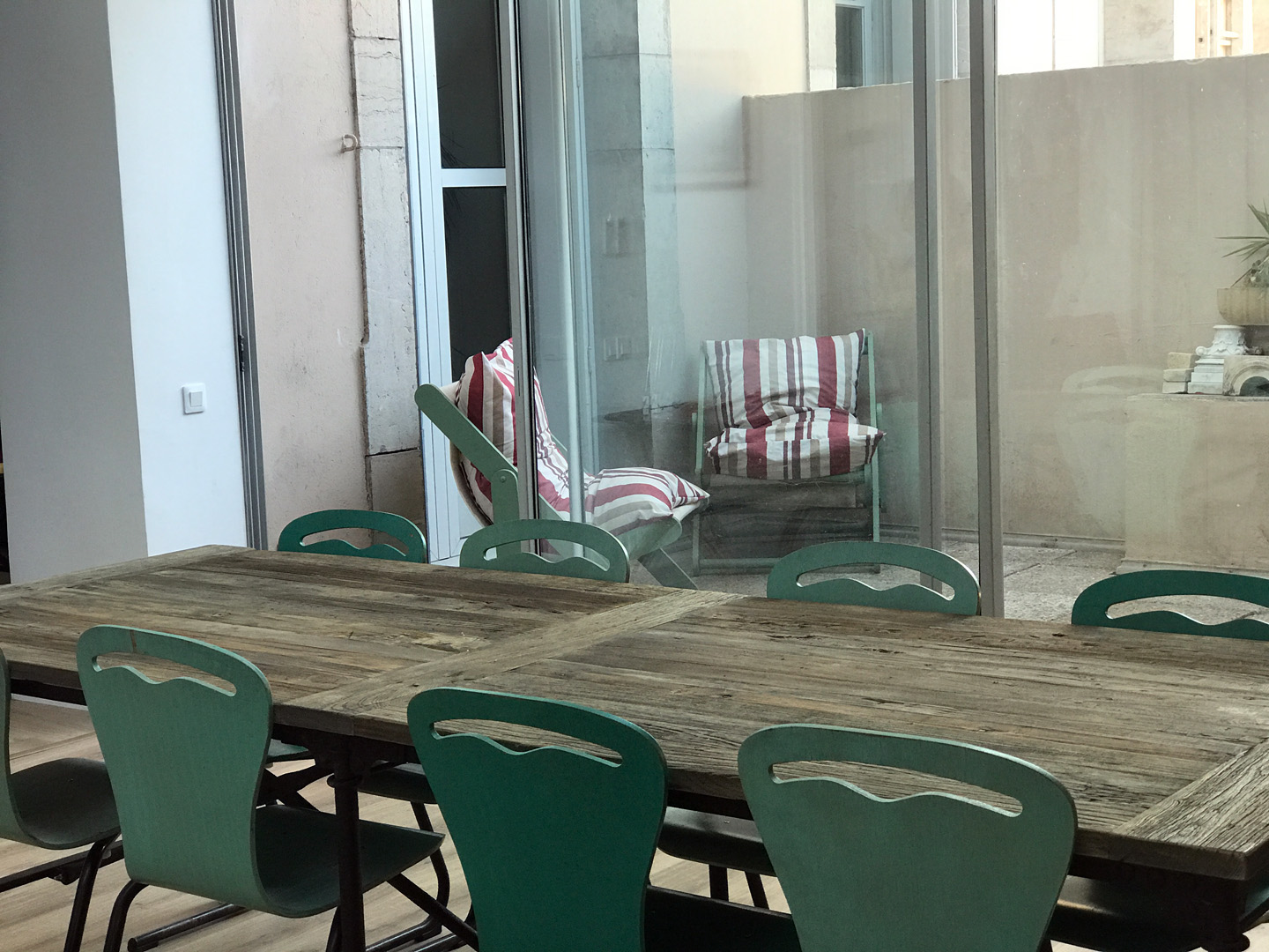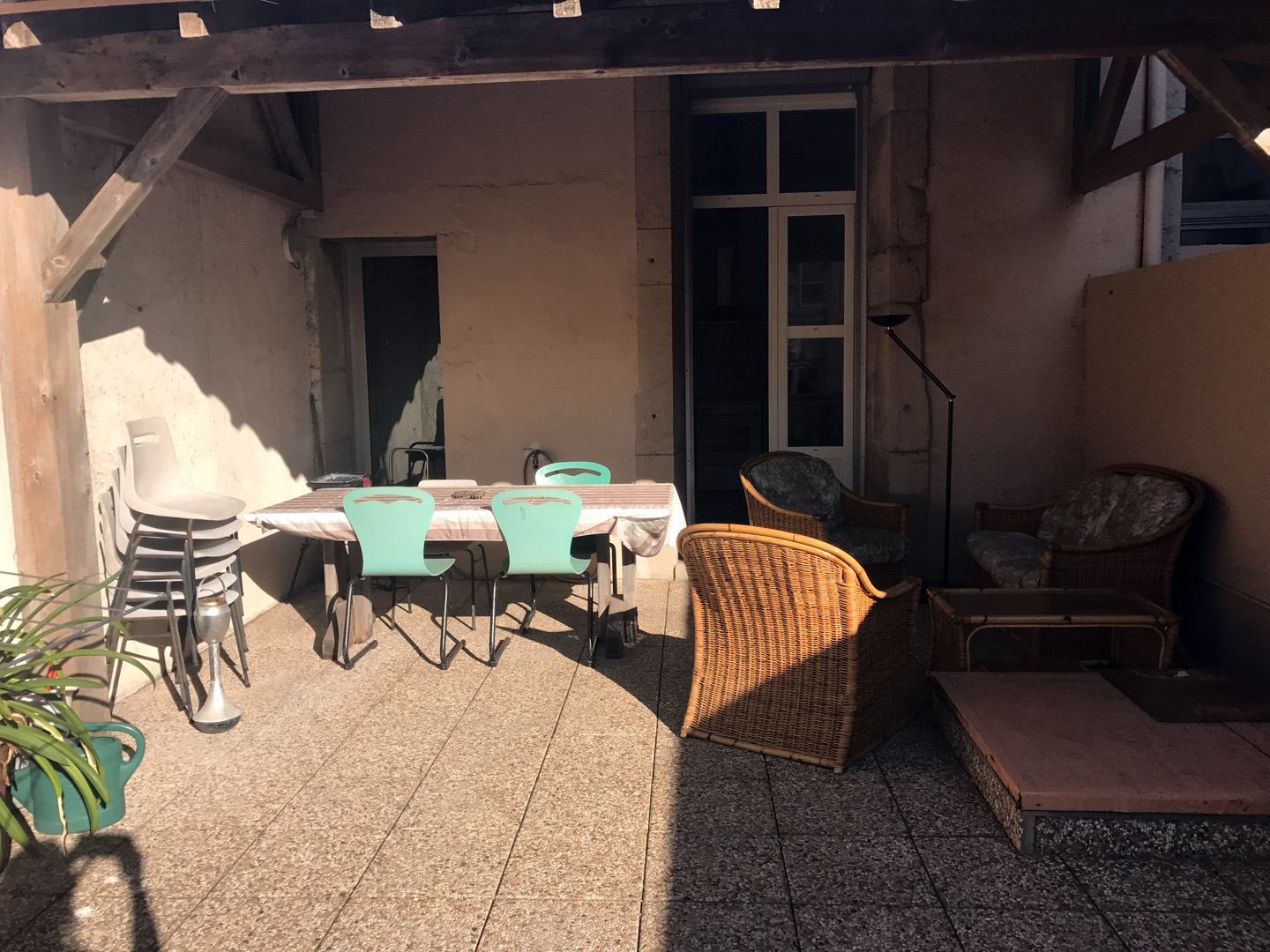 Terrasse avec salon de jardin et table, petite vue sur quai